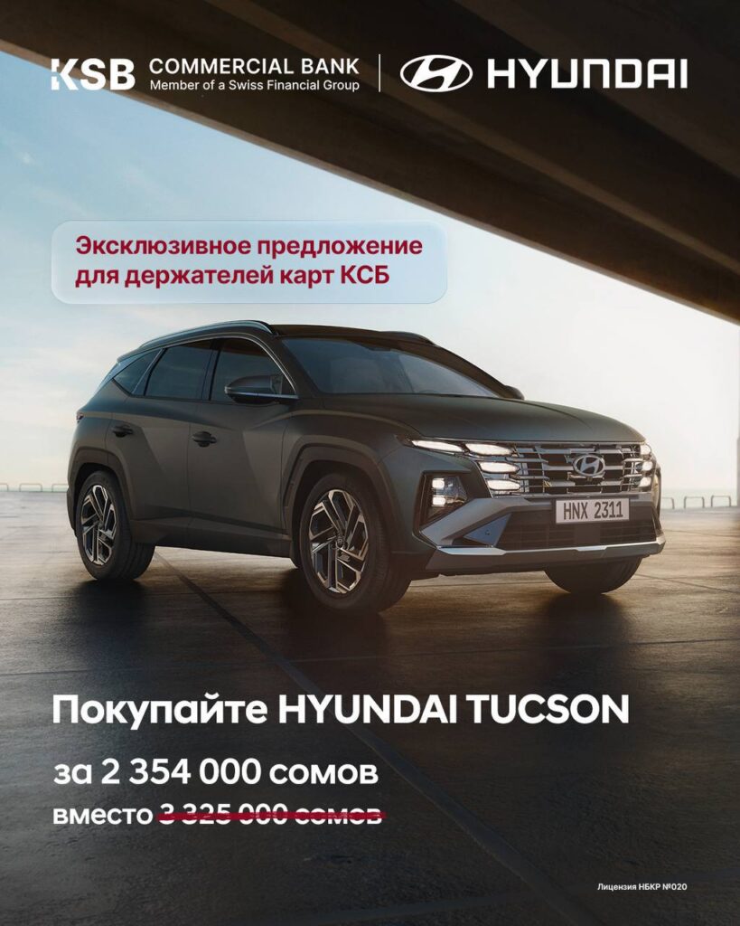 Open a Visa Signature card at KSB Commercial Bank and receive an additional 10% discount on a new Hyundai TUCSON from an official dealer. The standard price of the vehicle is 3,325,000 KGS.